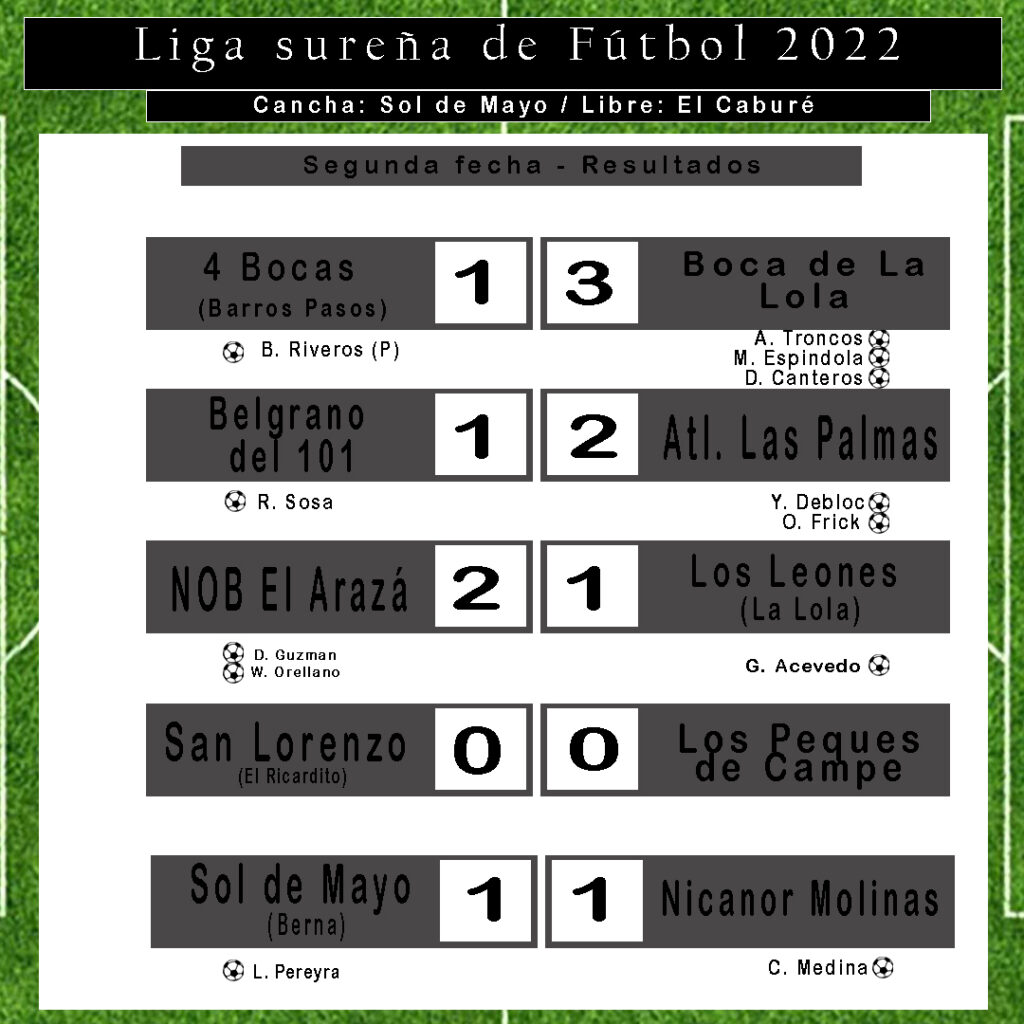 Pese a las malas condiciones meteorológicas, este domingo 10 de abril, se llevó a cabo la segunda fecha de la Liga de Integración Sureña, en la cancha de Sol de Mayo (Berna), con un excelente estado del campo de juego, para el desarrollo de todos los partidos, bajo la lluvia.