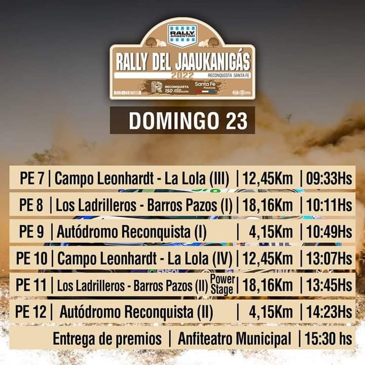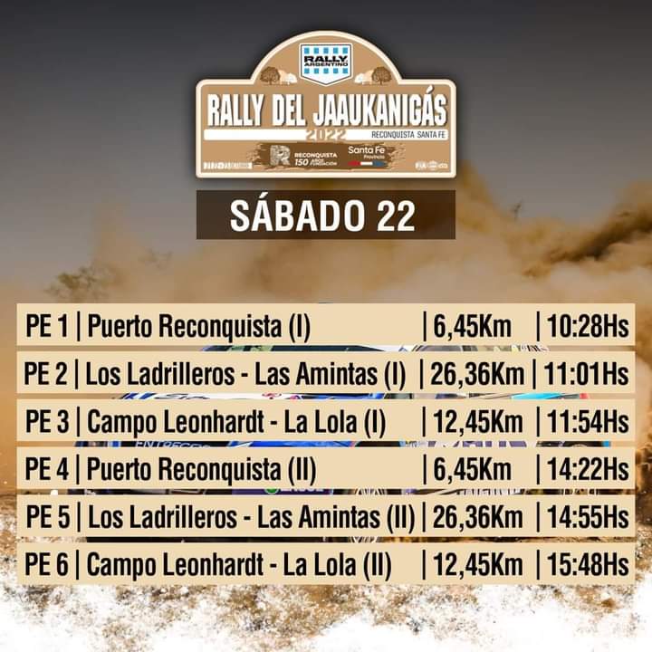 Seis pruebas especiales están previstas para hoy, sábado, desde las 10.30 horas con los siguientes tramos: Puerto Reconquista (6,5 km), Ladrilleros – Las Amintas (26 km), Campo Leonhardt – La Lola (12,400 km).