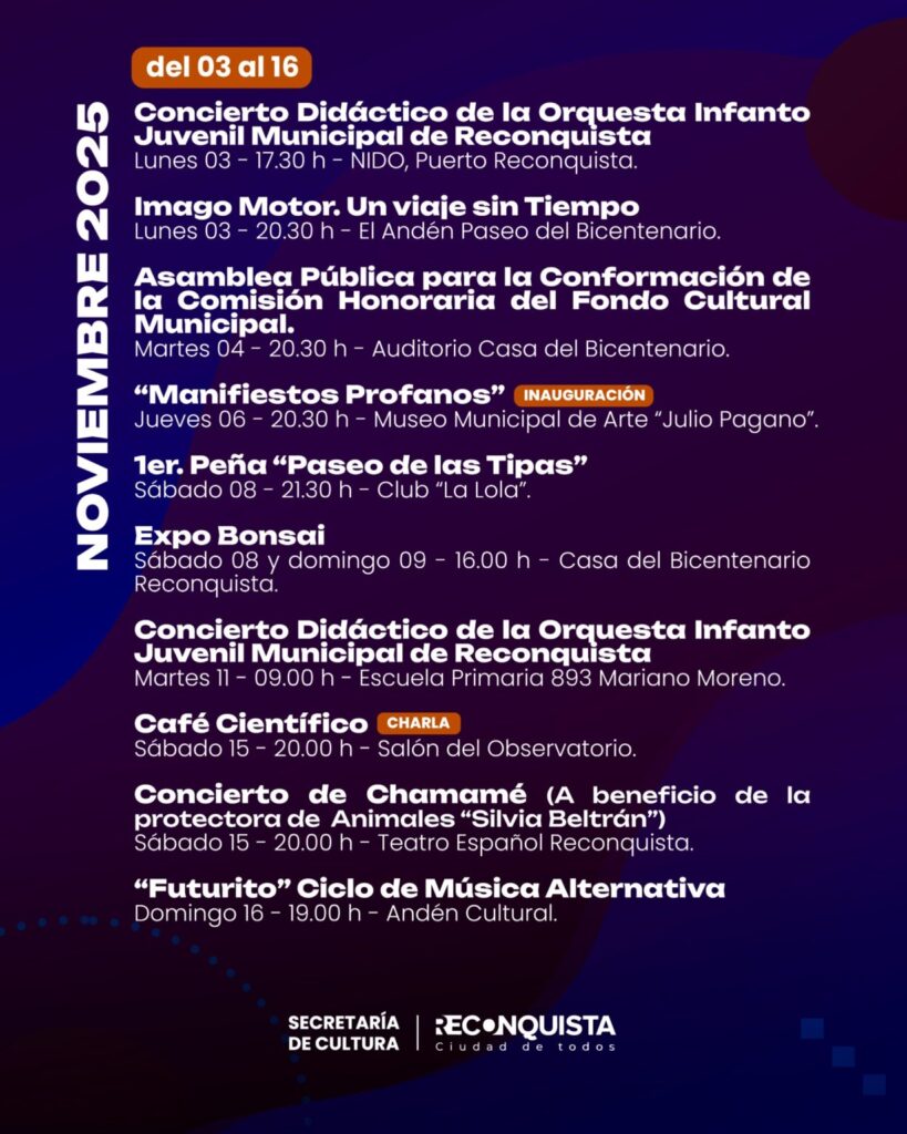 La Municipalidad de Reconquista invita a toda la comunidad a participar de una variada programación artística y cultural durante el mes de noviembre de 2025. La ciudad vivirá semanas de arte, música, danza, teatro y tradición, con propuestas para disfrutar en familia y con amigos.