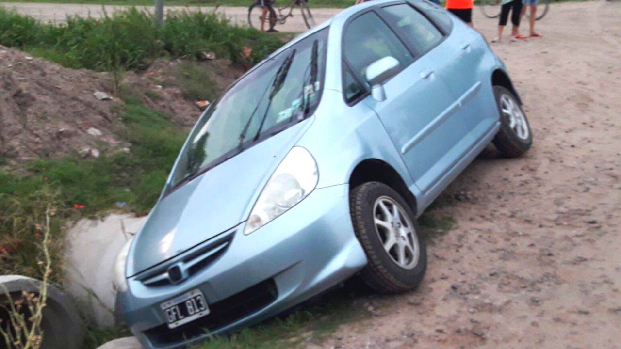 Un automóvil conducido por una mujer, que circulaba por una calle muy angosta, cayó de costado en una profunda cuneta cuando cedió el paso a otro vehículo que venía de frente. Las ruedas derechas quedaron sobre unas alcantarillas, evitando que el Honda Fit cayera en su totalidad.